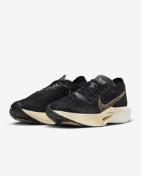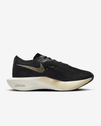 Catch ‘em if you can. Giving you race-day speed to conquer any distance, the Nike Vaporfly 3 is made for the chasers, the racers, the elevated pacers who can’t turn down the thrill of the pursuit. We reworked the leader of the super shoe pack and tuned the engine underneath to help you chase personal bests from a 10K to marathon. From elite runners to those new to racing, this versatile road-racing workhorse is for those who see speed as a gateway to more miles and more seemingly uncatchable highs. More Benefits - Light padding on the tongue helps reduce lace pressure at the top of your foot. - A new Waffle outsole pattern with perforations saves weight and delivers multi-surface traction in various weather conditions. - Offset heel seam helps reduce friction in the heel area. Product Details - Weight: Approx. 200 g (Men's size 10) - Heel-to-toe drop: 8 mm - Wider toe area for a roomier fit - Internal foam pod at heel for extra cushioning - Shown: Black/Black/Oatmeal/Metallic Gold Grain - Style: DV4129-001