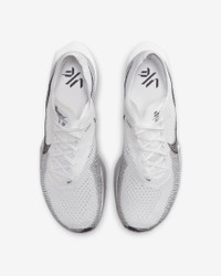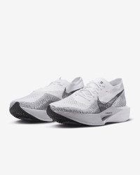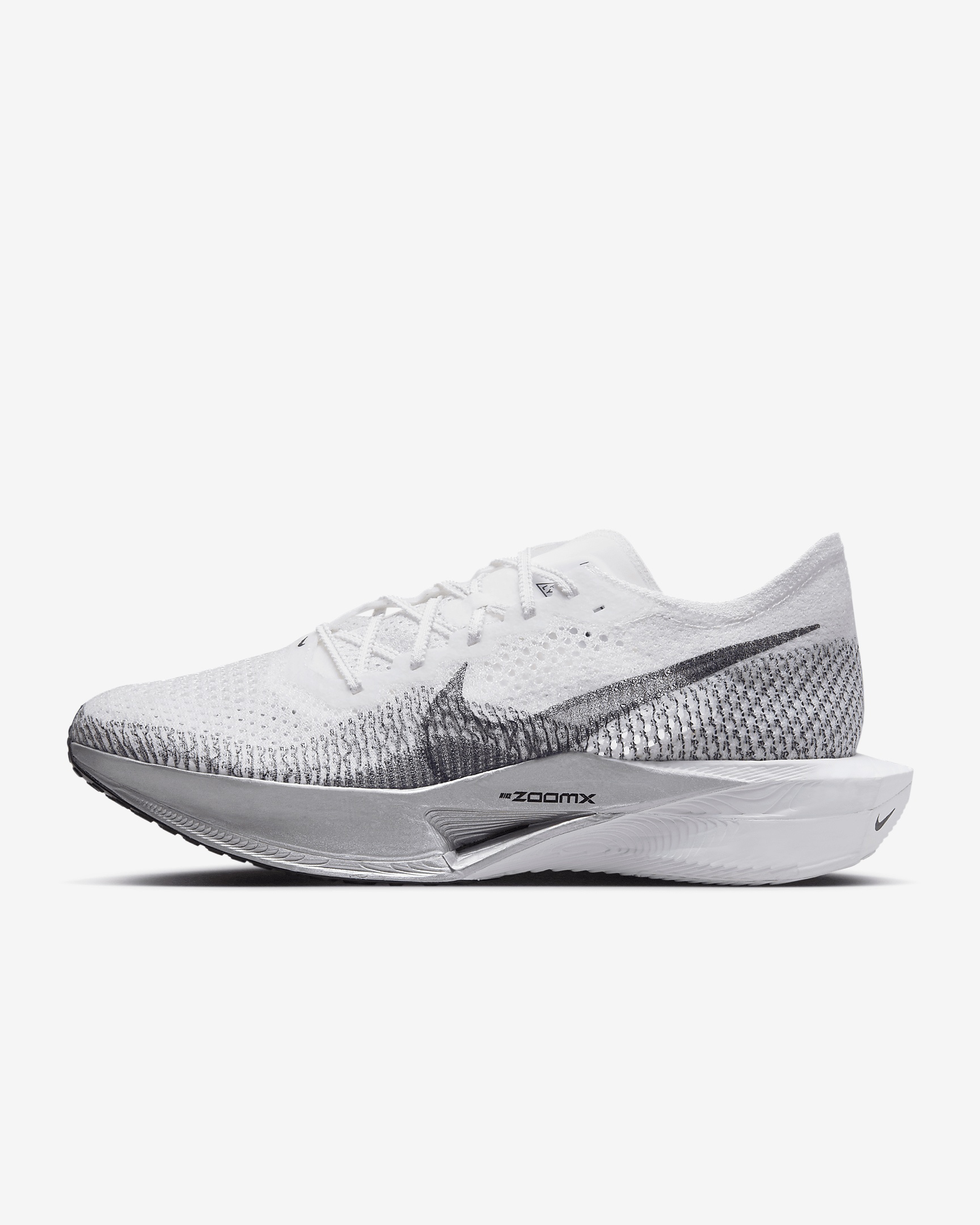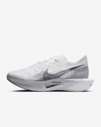 Catch ‘em if you can. Giving you race-day speed to conquer any distance, the Nike Vaporfly 3 is made for the chasers, the racers, the elevated pacers who can’t turn down the thrill of the pursuit. We reworked the leader of the super shoe pack and tuned the engine underneath to help you chase personal bests from a 10K to marathon. From elite runners to those new to racing, this versatile road-racing workhorse is for those who see speed as a gateway to more miles and more seemingly uncatchable highs. More Benefits - Light padding on the tongue helps reduce lace pressure at the top of your foot. - A new Waffle outsole pattern with perforations saves weight and delivers multi-surface traction in various weather conditions. - Offset heel seam helps reduce friction in the heel area. Product Details - Weight: Approx. 200 g (Men's size 10) - Heel-to-toe drop: 8 mm - Wider toe area for a roomier fit - Internal foam pod at heel for extra cushioning - Shown: White/Particle Grey/Metallic Silver/Dark Smoke Grey - Style: DV4129-100