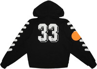 The Nikelab x OFF WHITE Mercurial NRG X Hoodie Black was a garment included in the collaborative collection between OFF WHITE and Nike brands.This Mercurial NRG X Hoodie features a "33" label on the back. The Off-White logo can be seen on the front of this hoodie in orange, while on the top right of the chest there is the Nike Swoosh logo. Another Virgil Abloh trademark, the white stripes, can be seen on the sleeves. The right sleeves have an orange circle on the back that complements the front's orange laces and logo, giving it its overall appearance.The Nikelab x OFF WHITE Mercurial NRG X Hoodie Black was released on June 14th, 2018 and retailed at $210. - Season SS18 - Color Black - Release Date 2018-06-14 - Retail Price 210 - Featured false