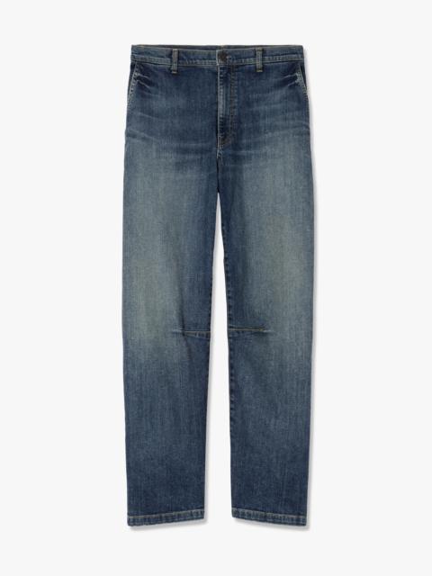 Barrel-legged pant in heavyweight Japanese black sulfur-dyed denim. Zip fly with jean shank closure at front. Slash pockets at front. Patch pockets at back. Hammer loop at back thigh. Stone-washed for a rich charcoal base shade and hand-sanded with a natural wear pattern for a well-worn appearance. Designed for a 27" inseam. - 100% Cotton - Machine wash cold - Low iron - Dry clean recommended - Tumble dry low - Do not bleach