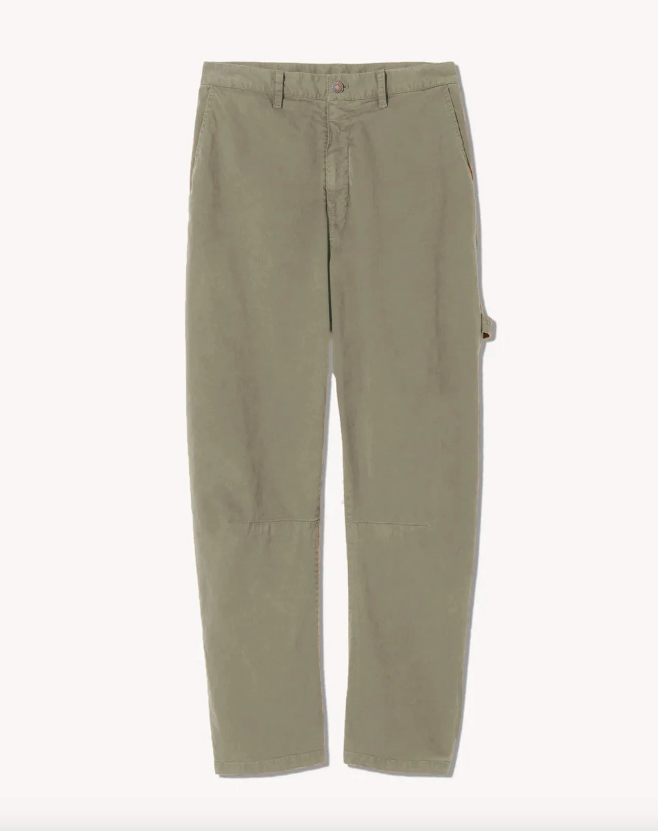 Flat front, boxy bowed leg pant emphasized by darts. Left utility strap. Front slash pockets. Back patch pockets. Fully constructed front zip. Horn button closure. Belt loops. Designed for a 26.5" inseam. - Made in USA - 98% Cotton, 2% Elastane - Machine wash cold - Low iron - Dry clean recommended