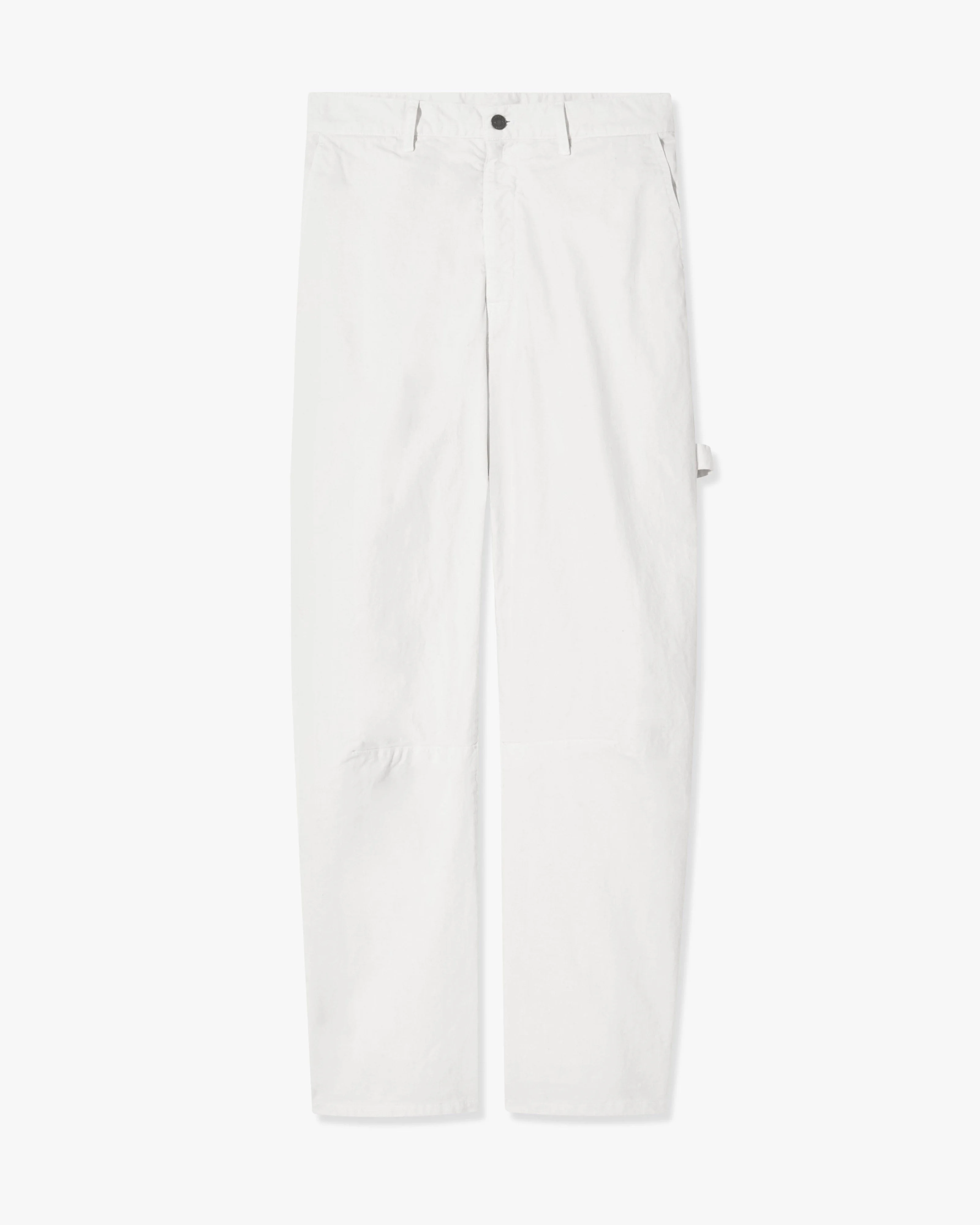 Flat front, boxy bowed leg pant empasized by darts. Left utility strap. Front slash pockets. Back patch pockets. Fully constructed front zip. Horn button closure. Belt loops. Made in USA SIZE & FIT For exact measurements by size, view our size guide. COMPOSITION & CARE 98% COTTON, 2% ELASTANE MACHINE WASH COLD LOW IRON DRY CLEAN RECOMMENDED