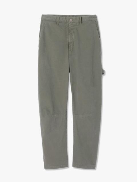Flat front, boxy bowed leg pant empasized by darts. Left utility strap. Front slash pockets. Back patch pockets. Fully constructed front zip. Horn button closure. Belt loops. Made in USA SIZE & FIT For exact measurements by size, view our size guide. COMPOSITION & CARE 98% COTTON, 2% ELASTANE MACHINE WASH COLD LOW IRON DRY CLEAN RECOMMENDED