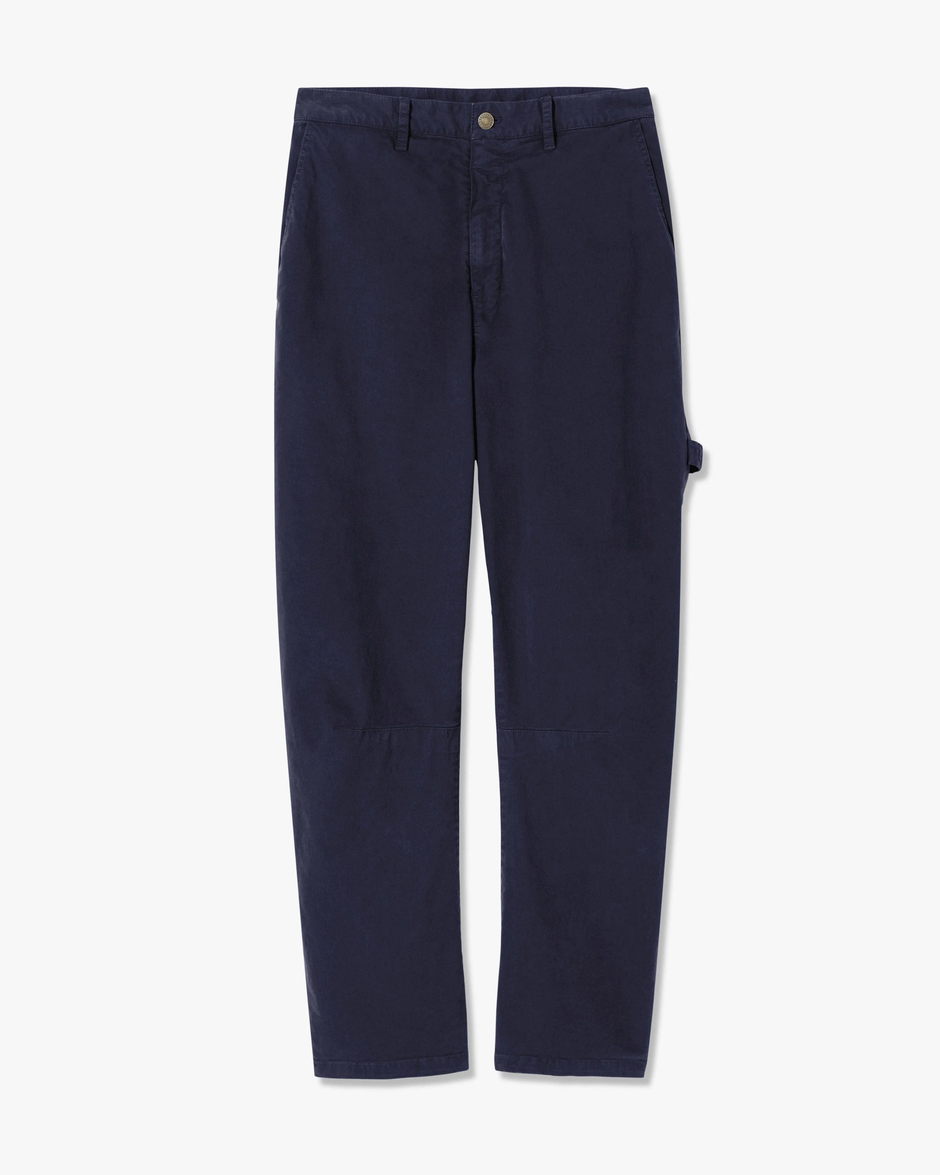 Flat front, boxy bowed leg pant emphasized by darts. Left utility strap. Front slash pockets. Back patch pockets. Fully constructed front zip. Horn button closure. Belt loops. Designed for a 26.5" inseam. - Made in USA - 98% Cotton, 2% Elastane - Machine wash cold - Low iron - Dry clean recommended