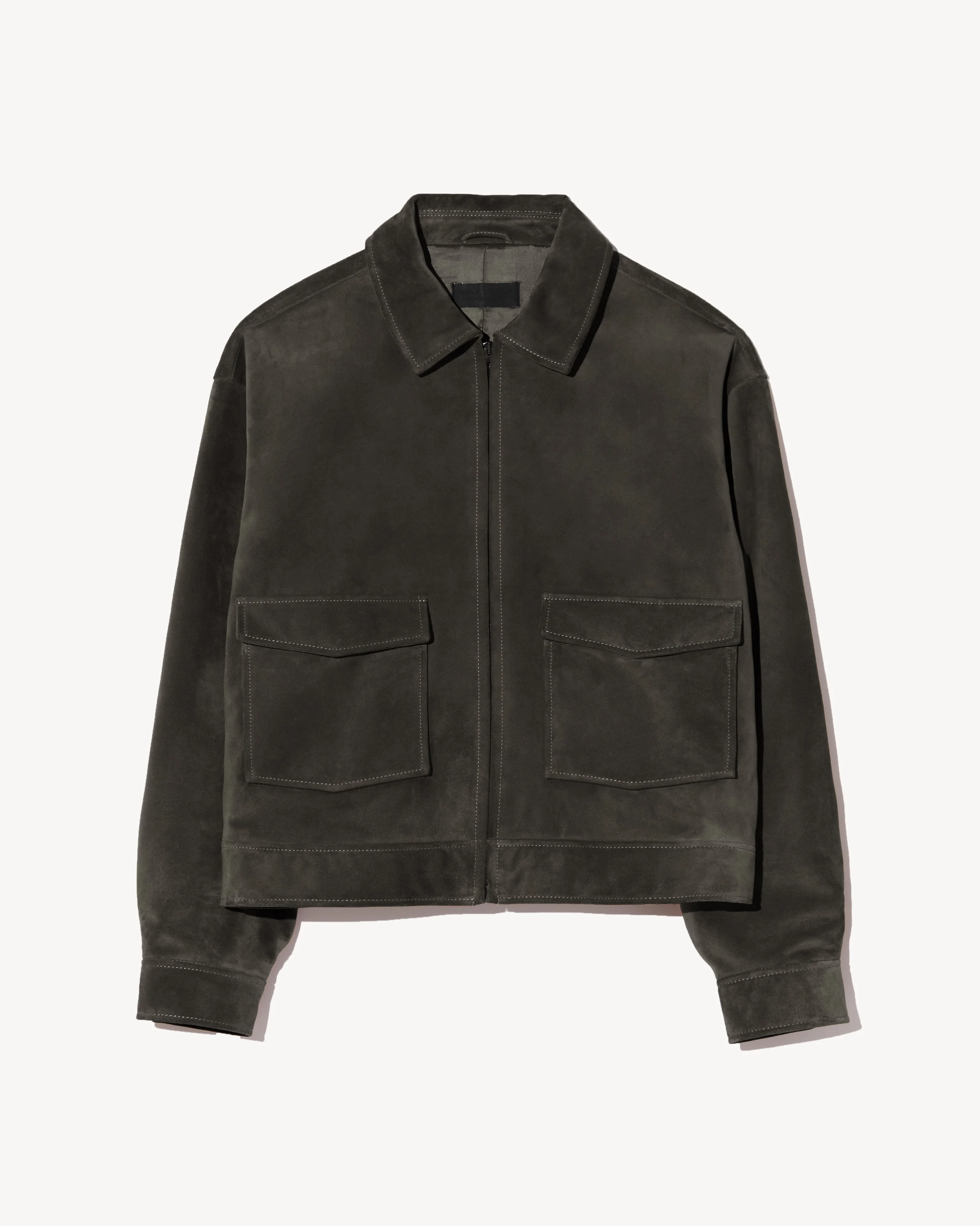 Zip up collared jacket in leather. Relaxed fit. Waist length. Dropped shoulder. Regular sleeve length. Center front zip closure. Front patch pockets with hidden snaps. Hidden snaps at sleeve cuff and waistband. Interior chest pocket. Fully lined. - 100% Lambskin Leather - Professional leather care only