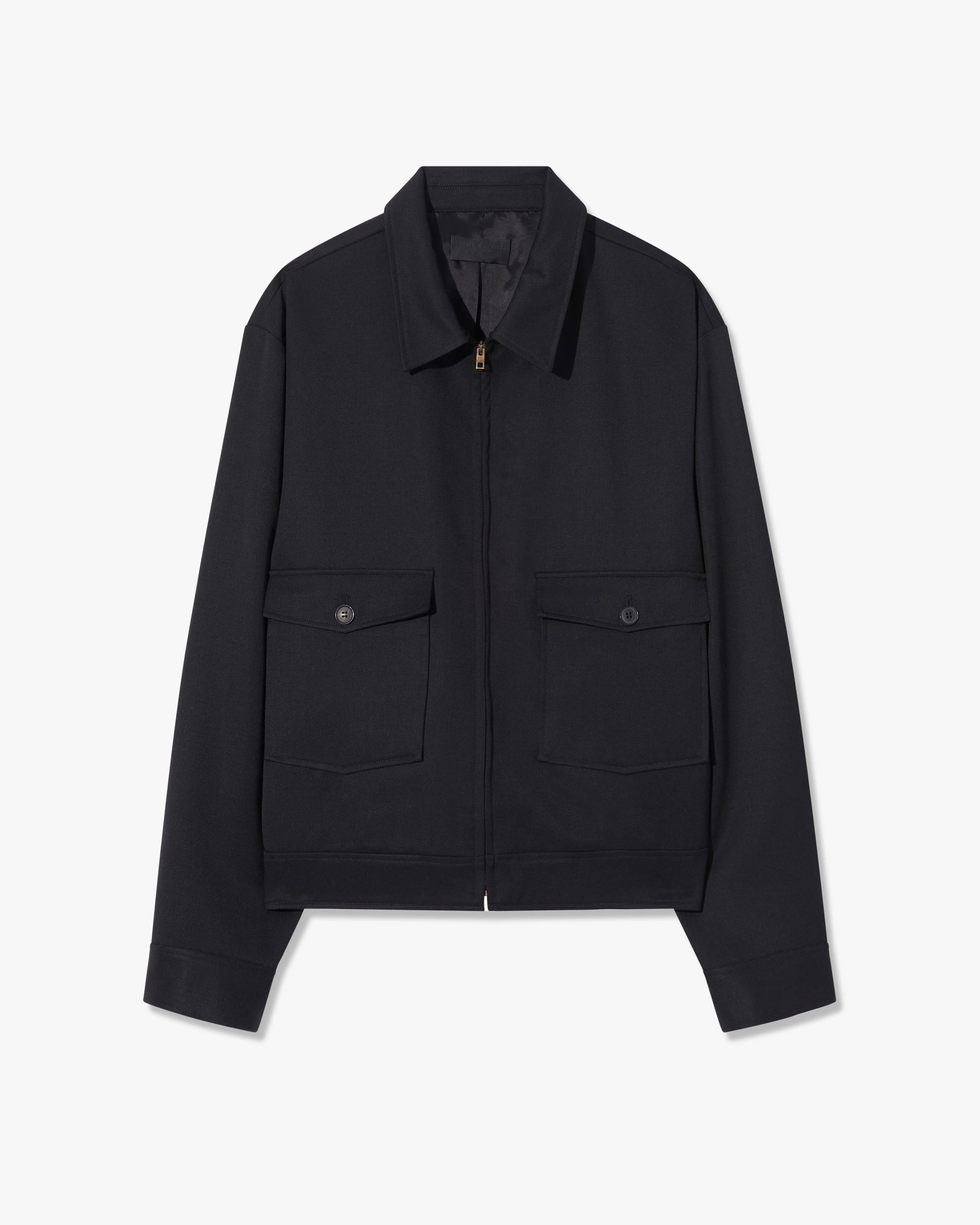 Relaxed, boxy zip up collared jacket in wool. Slightly dropped shoulder. Center front zip closure. Front patch pockets. Horn buttons at sleeve cuff and waistband. Interior chest pocket. Not constructed. Fully lined. Made in USA COMPOSITION & CARE 100% VIRGIN WOOL DRY CLEAN ONLY