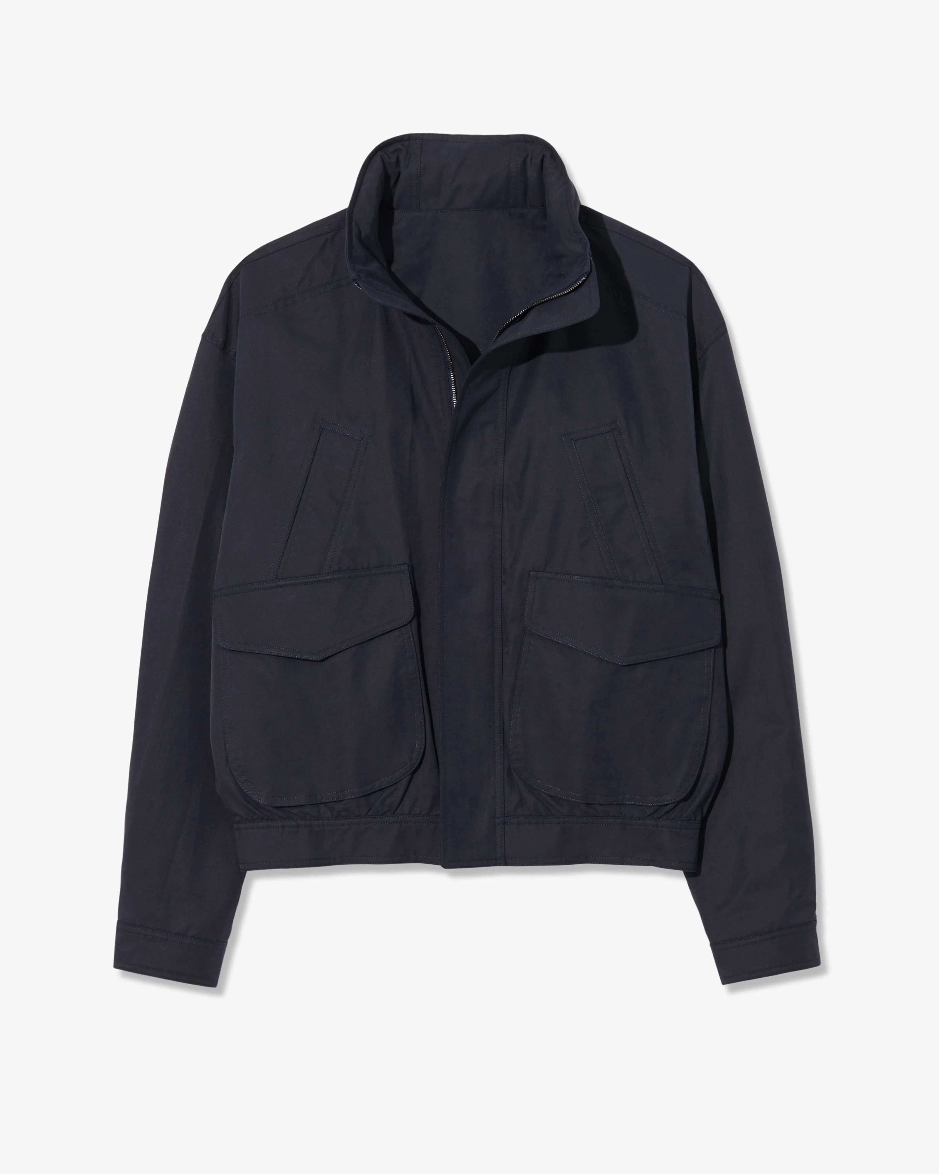 Relaxed bomber jacket in water resistant cotton nylon blend. Hidden snap closure. Zip front. Patch pockets. Chest slant pockets. Snaps at cuffs. Cinched waist. Interior chest pocket. Hidden zipper at collar with hood. Not constructed. Fully lined. Made in USA COMPOSITION & CARE 64% COTTON 36% NYLON DRY CLEAN RECOMMENDED LOW IRON