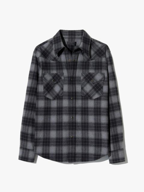 Classic, straight fit collared jean shirt. Western details. Pearl snap buttons. Chest flap pockets. Standard placket. Center front buttons. Buttons at cuff. Made in USA COMPOSITION & CARE 100% Cotton Hand wash Do not bleach Do not tumble dry Low iron Dry clean