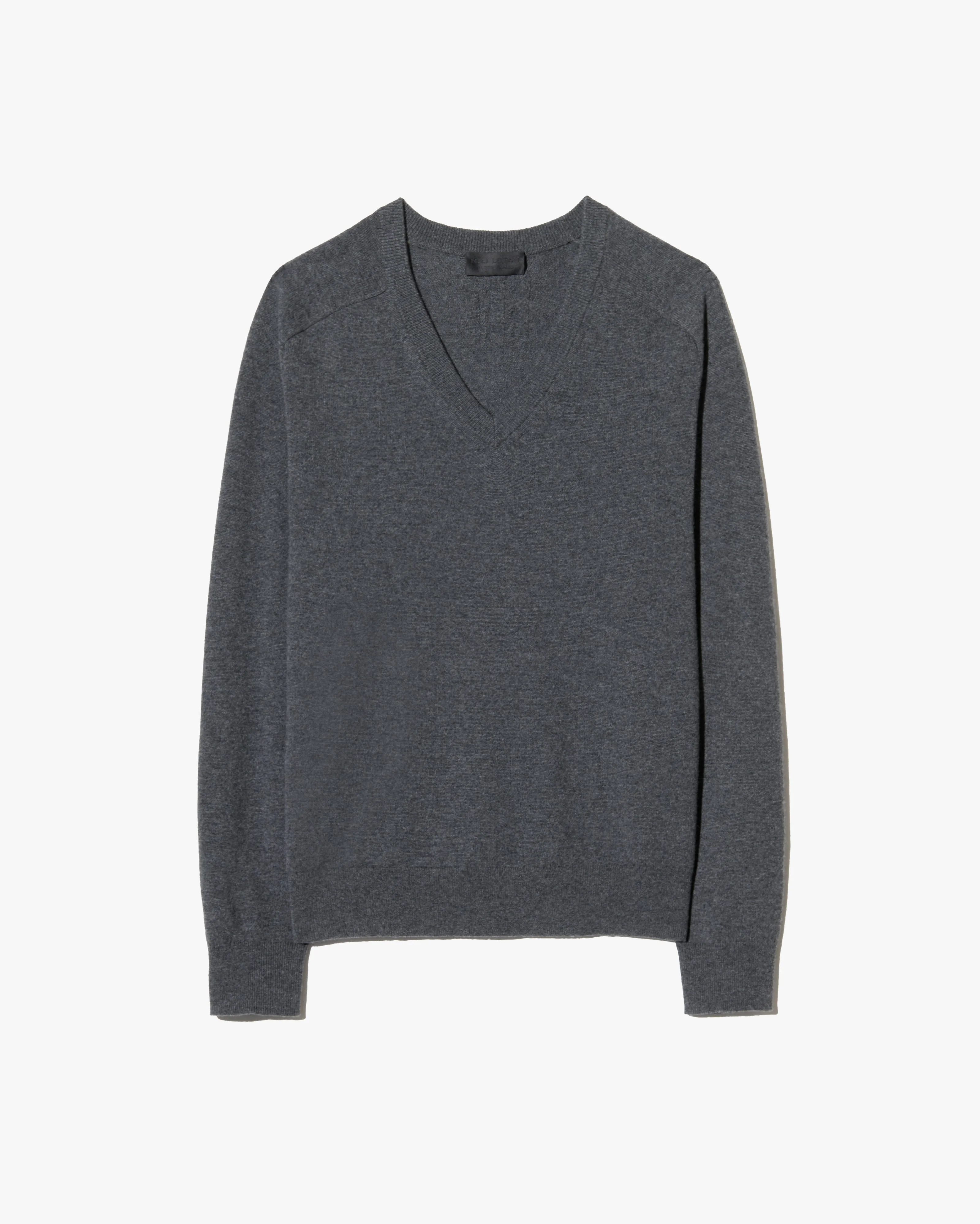 Long sleeve v-neck pullover sweater. Light weight in jersey stitch. Relaxed fit. Medium body length. Regular sleeve length with saddle shoulder. 1x1 rib at hem and cuff. Neck trim in double layer 1x1 rib. Fashioning at armhole and sleeve. Center back signature cable detail. - 100% Cashmere - Dry clean only