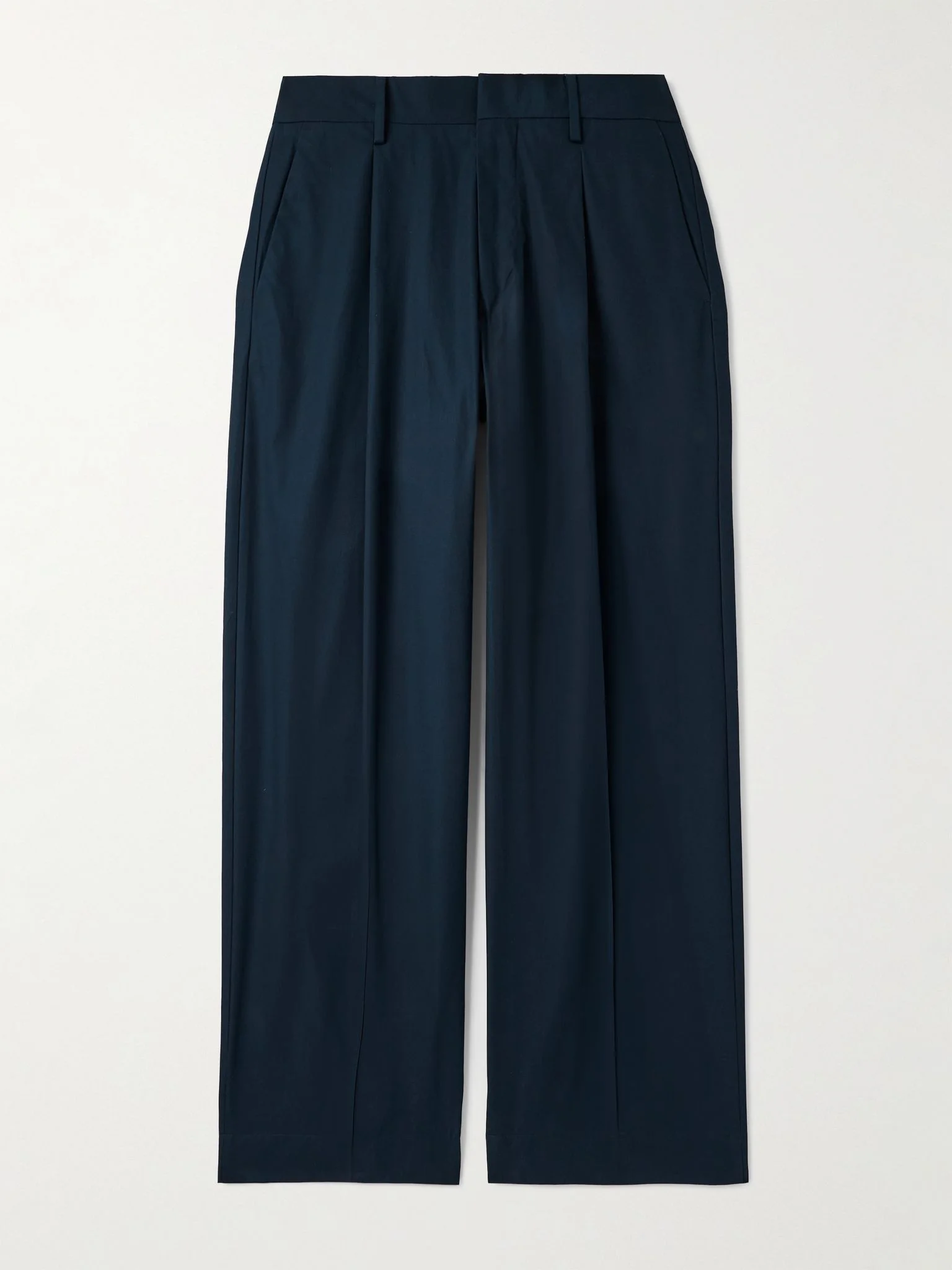 Kay 1080 Straight-Leg Pleated Organic Cotton-Poplin Trousers Navy