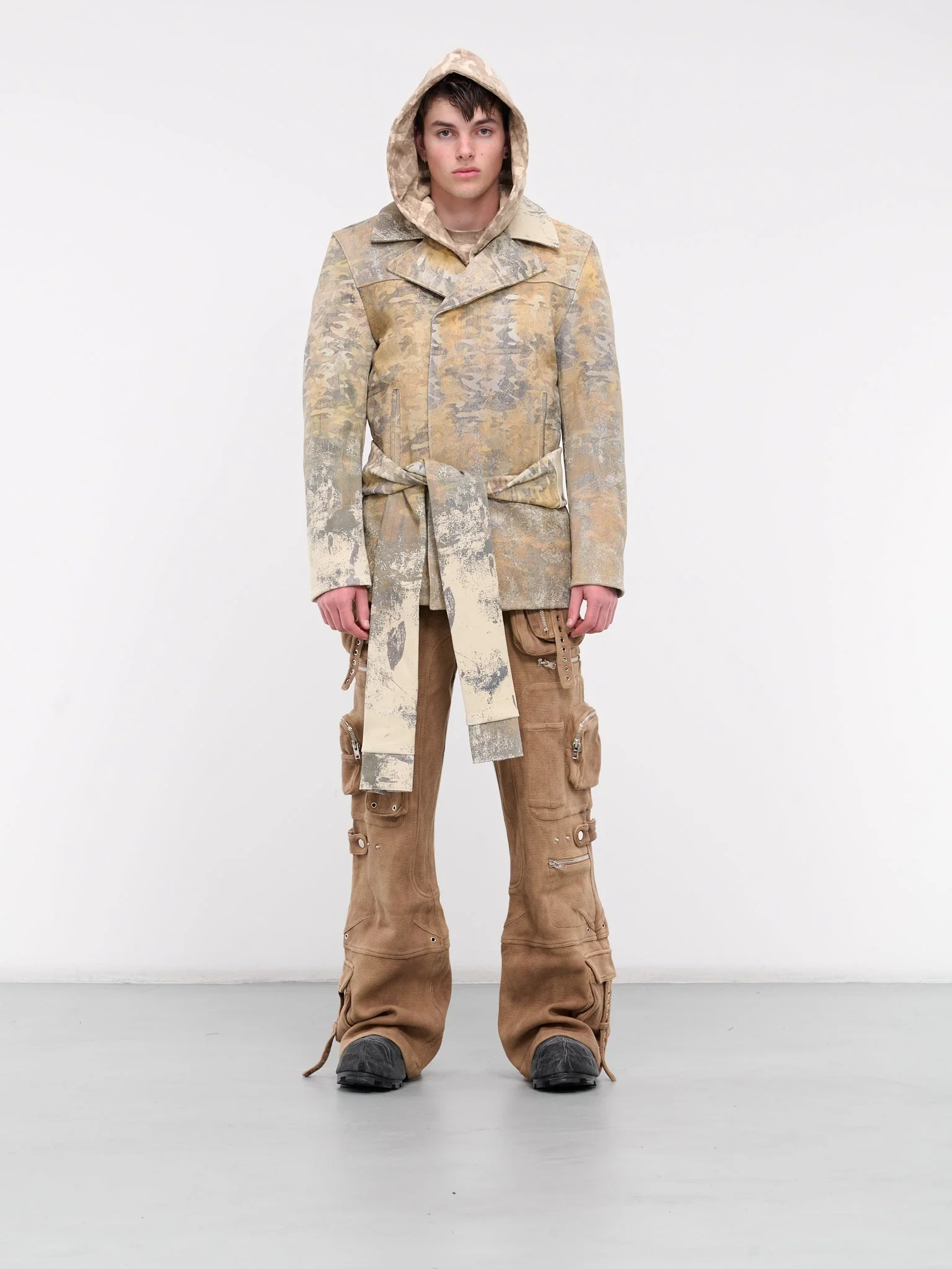 NO/FAITH STUDIOS jacket in beige, blazer design, paneled leather construction, camouflage print, notched lapel, front double-breasted concealed placket closure, structured shoulders, long sleeves, side welt pockets, waist wraparound sleeve belt detailing, back vent, straight hem, regular fit. 100% Cotton European Sizing Model is 6’1” wearing size 52. Shoulders: 19” Chest: 38” Waist: 31”