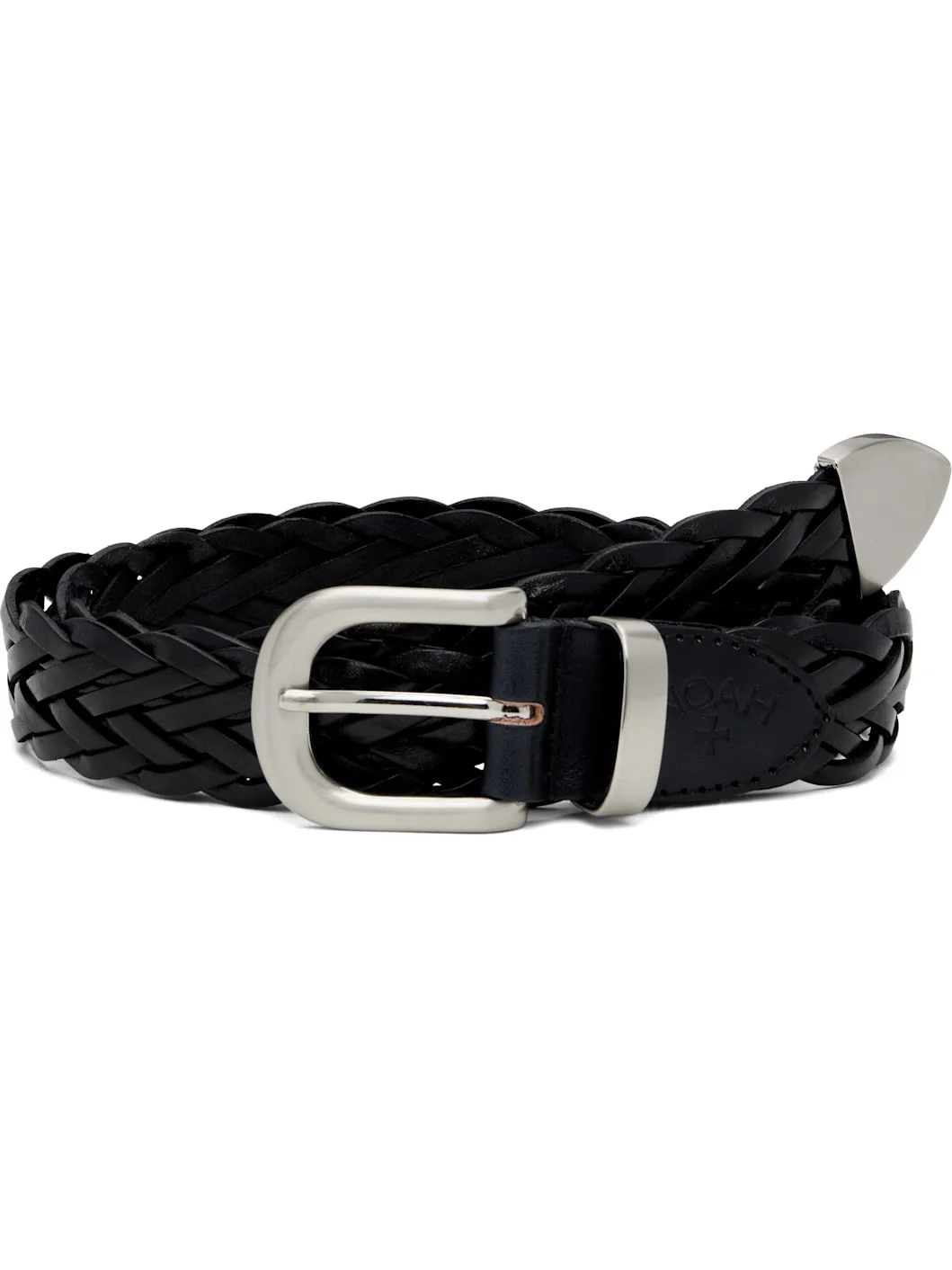 Braided grained leather belt. · Embossed logo and keeper loop at length · Hardware at end · Pin-buckle fastening · Silver-tone brass hardware · W1.25" Supplier color: Black Leather. Made in Portugal 251876M131000