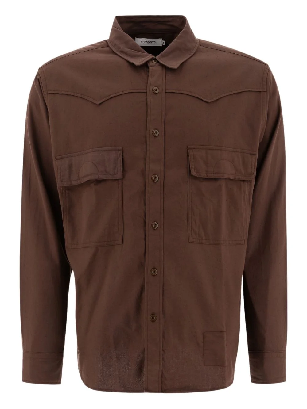 double-pocket western shirt Highlights - Brown - Button front - Two chest pockets - Long sleeves Imported Composition Cotton 77%, Silk 23% Washing instructions Read Manufacturer Guidelines