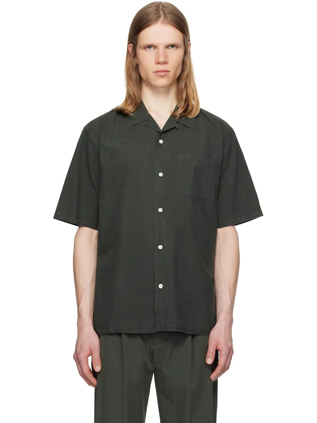 Garment-dyed cotton- and tencel-blend poplin shirt. · Open spread collar · Button closure · Patch pocket · Mother-of-pearl hardware Supplier color: Black olive 50% cotton, 50% tencel. Made in Portugal 252116M192009