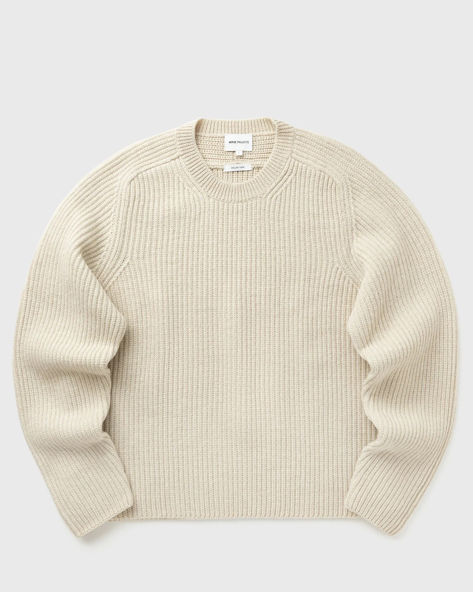 The Sigurd Military Rib Crew Neck by Norse Projects combines coarse knitwear with military thermal underwear inspiration. Made from Italian yarn, it features a ribbed collar, cuffs, saddle shoulders that transition into a back yoke, and a clean, chain-stitched hem. ##- Pure wool, 5 gauge, 6-ply - Regular fit - Italian yarn Article number: N45-0656-0957 Gender: men Color: Ecru Material: 100% Wool