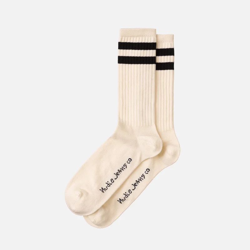 Comfy sport socks. The stripes may vary, but the cotton is always organic. Details - Organic cotton - Semi fine knit - Jacquard logo on the sole - Leg height 27 cm - One size (EU 41-45) 75% Cotton 23% Polyamid 2% Elastane Made in PT Sneak in some sport in your life with these smart, striped socks made with organic cotton. The Nudie Jeans Co logo on the sole.