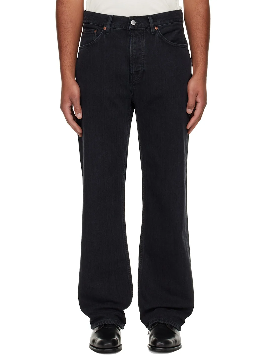 12.25 oz non-stretch organic cotton-blend denim jeans. · Fading throughout · Loose-fit · High-rise · Belt loops · Five-pocket styling · Button fly · Logo patch at back waistband and pocket Supplier color: Black vintage 100% cotton. Made in Tunisia 252078M186006
