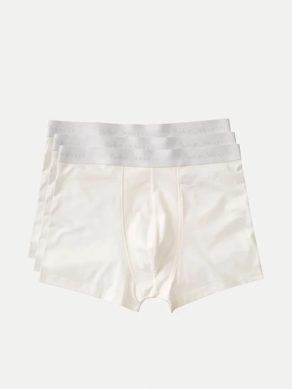 3-pack with our regular-fit boxer briefs made in organic and Fairtrade cotton. Details - Organic and Fairtrade cotton - 3-pack - Part of Nudie Jeans Essentials - Delivered in recycled cotton cardboard box - Regular fit 92% Cotton 8% Elastane Made in IN Wear Nudie from layer one with underwear made in soft jersey that is both organic and Fairtrade. This garment is part of the Nudie Jeans Essentials. The fit is an updated version of our boxer brief. It's slightly bigger with a bit longer legs and a more shaped center front seam. Instead of labels, it has a print on the inside. The Essential styles are delivered in beautiful cardboard boxes made with recycled cotton. When you buy Nudie Jeans underwear, you can be sure that we have paid our share of living wages for it.