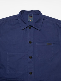 Details - Organic cotton - Rigid herringbone twill - Matching thread at seams - Corozo buttons - Regular fit This regular-fit chore jacket offers a neat and spacious design, featuring one chest pocket, one roomy inside pocket, and two front pockets. The pockets are securely attached with single stitches that form small triangles at the pocket openings, reinforcing both functionality and aesthetics. The main seams are sewn with felled twin-needle seams, providing a clean and sturdy construction. From its silhouette to its making, Buddy is our love for simplistic workwear jackets condensed into one, simple and beautiful, jacket. This particular Buddy jacket is crafted from exquisite herringbone twill fabric. Its tightly woven construction gives it a slightly crisp texture, a dry feel, and a smooth appearance. The pattern of the fabric pays homage to vintage herringbone twills, and to ensure longevity and desirable aging properties, we have piece-dyed it in a perfect deep blue shade. The jacket has undergone a gentle wash, subtly accentuating the fabric's characteristics and garment construction. Curious to learn more about herringbone twill? We're delighted you asked! Herringbone twill is a variation of the regular twill weaving pattern. While regular twill, as seen in denim, exhibits a distinct diagonal pattern, herringbone twill features broken diagonal lines, creating a noticeable zig-zag pattern (more prominent than in a broken twill). The zig-zag pattern, resembling the bone structure of a herring, is compact yet distinctive. Herringbone twill is commonly found in vintage workwear jackets, particularly those of French and German origin, often in blue or grey hues. Moreover, it is well-known for its usage in vintage military garments, commonly referred to by its acronym HBT. The choice of herringbone twill in workwear and military garments can, to our knowledge, be attributed to two primary reasons. Firstly, the alteration of the twill direction enhances tear resistance. Secondly, during a time when sanforization and skewing processes were not yet developed, herringbone twill exhibited a reduced tendency to skew compared to regular twill. This aspect, similar to the purpose behind the development of broken twill, contributed to its popularity. There you have it, the ins and outs of herringbone twill.