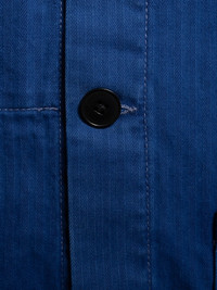 Regular-fit chore jacket with a neat and spacious design crafted from exquisite organic herringbone twill fabric. Size & Fit Model is wearing size: M Model's height: 183 cm / 6’0” Details - Organic cotton - Rigid herringbone twill - Dark blue thread at seams - Black Corozo buttons - Regular fit 100% Cotton Made in TN This regular-fit chore jacket offers a neat and spacious design, featuring one chest pocket, one roomy inside pocket, and two front pockets. The pockets are securely attached with single stitches that form small triangles at the pocket openings, reinforcing both functionality and aesthetics. The main seams are sewn with felled twin-needle seams, providing a clean and sturdy construction. From its silhouette to its making Buddy is our love for simplistic workwear jackets condensed into one, simple and beautiful, jacket. This particular Buddy jacket is crafted from exquisite herringbone twill fabric. Its tightly woven construction gives it a slightly crisp texture, a dry feel, and a smooth appearance. The pattern of the fabric pays homage to vintage herringbone twills, and to ensure longevity and desirable aging property, we have piece-dyed it in a perfect French blue shade. The jacket has undergone a gentle wash, subtly accentuating the fabric's characteristics and garment construction. Curious to learn more about herringbone twill? We're delighted you asked! Herringbone twill is a variation of the regular twill weaving pattern. While regular twill, as seen in denim, exhibits a distinct diagonal pattern, herringbone twill features broken diagonal lines, creating a noticeable zig-zag pattern (more prominent than in a broken twill). The zig-zag pattern, resembling the bone structure of a herring, is compact yet distinctive. Herringbone twill is commonly found in vintage workwear jackets, particularly those of French and German origin, often in blue or grey hues. Moreover, it is well-known for its usage in vintage military fatigues, commonly referred to by its acronym HBT. The choice of herringbone twill in workwear and military garments can, to our knowledge, be attributed to two primary reasons. Firstly, the alteration of the twill direction enhances tear resistance. Secondly, during a time when sanforization and skewing processes were not yet developed, herringbone twill exhibited a reduced tendency to skew compared to regular twill. This aspect, similar to the purpose behind the development of broken twill, contributed to its popularity. There you have it, the ins and outs of herringbone twill.