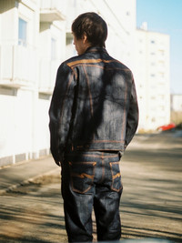 The Nudie Jeans classic, Conny - a slim fit denim jacket with our signature asymmetrical chest pockets and back yoke embroidery - is back in limited numbers. Details - Organic cotton - 13.7 oz. rigid denim - Orange thread at all seams - Copper buttons - Jacron patch - Slim fit 100% Cotton Made in TN The Nudie Jeans classic, Conny - a slim fit denim jacket with our signature asymmetrical chest pockets and back yoke embroidery - is back in limited numbers. The Dry Streaky is crafted from exceptional streaky denim featuring pronounced vertical slubs of varying lengths. As the denim ages with wear, its striking texture becomes more pronounced; initially, the vertical slubbiness stands out, and over time, with washing, a subtle crosshatch texture emerges, creating a rich and dynamic textural journey. The greatest part of this denim jacket is not what it looks like new, but rather the complete opposite - how it will look tomorrow, and the many days to come. Enjoy aging, it is worth the trouble.