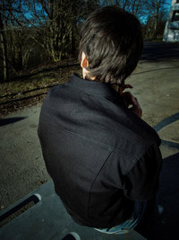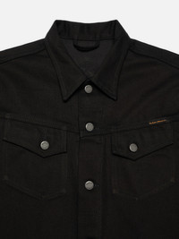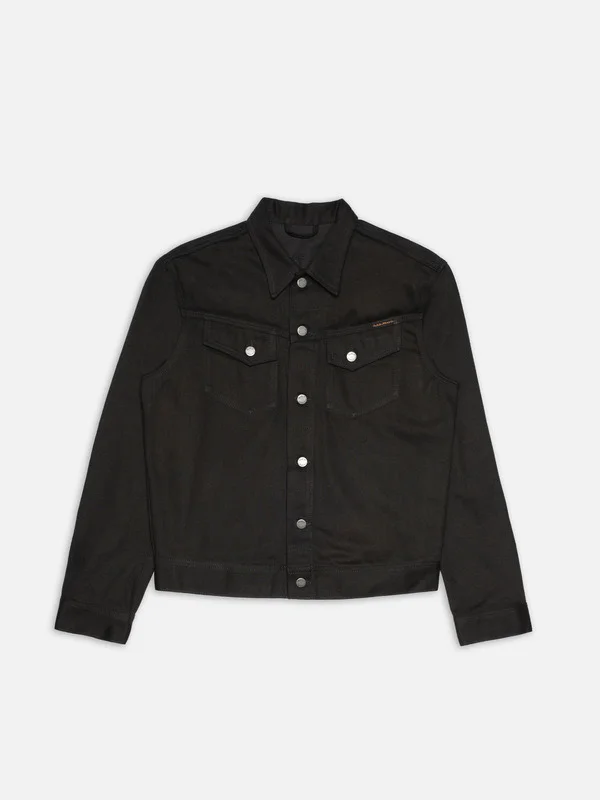 The Nudie Jeans classic, Conny - a slim fit denim jacket with our signature asymmetrical chest pockets and back yoke embroidery - returns in limited numbers. Details - Organic cotton - 12.3 oz. rigid denim - Black thread at all seams - Antique silver buttons - Jacron patch - Slim fit 100% Cotton Made in TN The Nudie Jeans classic, Conny - a slim fit denim jacket with our signature asymmetrical chest pockets and back yoke embroidery - returns in limited numbers. Crafted from pitch-black, "black overdyed black denim", the Dry Black Tar offers a soft hand feel and a deep black hue that gradually fades into smooth, grey tones. The ring-spun denim showcases a uniform texture with a hint of vertical streakiness. Over time, this streakiness becomes more pronounced with wear, and subtle marble effects emerge through washing, creating a rich, evolving texture marked by muted black and grey tones. The greatest part of this denim jacket is not how it looks when it's new, but rather the complete opposite - how it will look tomorrow, and the many days to come. Enjoy aging, it is worth the trouble.