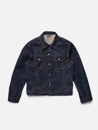 Danny, our regular fit denim jacket crafted from the extraordinary Dry Ace Selvage. Made from organic cotton. Size & Fit Model is wearing size: M Model's height: 189 cm / 6’2” Details - Organic cotton - 14.2 oz. rigid denim - Tobacco thread at all seams - Navy buttonholes - Antique silver buttons - Jacron patch - Regular fit 100% Cotton Made in TN We are thrilled to introduce our regular fit denim jacket Danny in the extraordinary Dry Ace Selvage. This remarkable fabric, weighing 14.2 oz showcases a rustic texture and a deep, redcast indigo hue, is a true masterpiece. Crafted by the renowned Shinya Mills in Okayama, Japan, it exemplifies the art of perfecting selvage denim imperfections. The story behind Dry Ace Selvage is as fascinating as the fabric itself. It all began with a vintage, unbranded pair of jeans believed to date back to the 1950s, discovered in a thrift store somewhere in the USA. These jeans displayed wear and significant fading, and most importantly an incredible texture. They made their way to Japan, where denim from the jeans was meticulously reverse-engineered in exhaustive detail. The art of reverse engineering denim is a hallmark of the artisanal Japanese denim industry. Dry Ace Selvage is a remarkable example of this craft, as well as a testament to the unique collaborative approach sometimes employed for premium Japanese denim. The rather extreme slub yarns are spun by Yamachu Mengyo Co. Ltd. in Osaka. The warp yarns undergo an impressive 20 dips in pure indigo dye, resulting in a deeply saturated surface with a notably substantial undyed core, courtesy of Kaihara Co. Ltd. in Hiroshima. Finally, the fabric is masterfully woven under low tension on vintage shuttle looms by Shinya Mills in Okayama. The guiding principle here is - do what you do best - and the final product beautifully reflects the craftsmanship at each stage of the denim's creation. Ace's distinctive character arises from its thick and highly irregular yarns, generous use of indigo, and low-tension weaving. These factors contribute to its appealingly rugged aging property. Over time, the dye rapidly abrades from the surface of the yarns, emphasizing their slub, particularly in the vertical direction. When, or if, the jeans are washed, the yarns slightly rearrange, reducing the vertical slub and transitioning to a rustic crosshatch texture with a coarse salt 'n pepper effect. Notably, the heavily saturated surface of the indigo yarns entails an extraordinary evolution. Washing initially causes the dye to bleed onto the white weft, increasing the depth of color. With successive washes, the indigo gradually fades into brighter brilliant blue hues while deeper tones are preserved at seams and folds. Due to its unparalleled aging property, Ace unquestionably stands as one of the finest Japanese selvage denims we have ever encountered. We are therefore very proud to offer it in Danny.