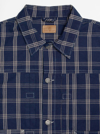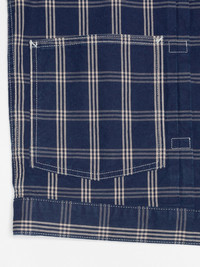 Regular-fit Dante II jacket with a straight yoke, patch-on pockets, and pleated front. Crafted from a unique checked indigo canvas weave, balancing ecru and deep indigo yarns for a refined workwear aesthetic. Made from organic cotton. Details - Organic cotton - 8.7 oz. Indigo yarn dyed check canvas - Cream thread at all seams - Antique silver button - Jacron patch - Regular fit 100% Cotton Made in TN Our second iteration of the regular-fit jacket, Dante, has arrived. It retains its classic regular fit, straight yoke, and patch-on pockets, while introducing a pleated front. This Dante II is crafted from our proprietary designed checked indigo canvas weave, and we must say, it's quite extraordinary. The pattern strikes a delicate balance between ecru yarns and deeply saturated indigo yarns, resulting in a refined interpretation of a denim workwear jacket. The dense and sturdy checked canvas adds substantial body to the jacket. With slightly irregular ringspun yarns, rich indigo dye, a half panama weave, and a generous amount of starch, this Dante II promises a unique breaking-in journey.