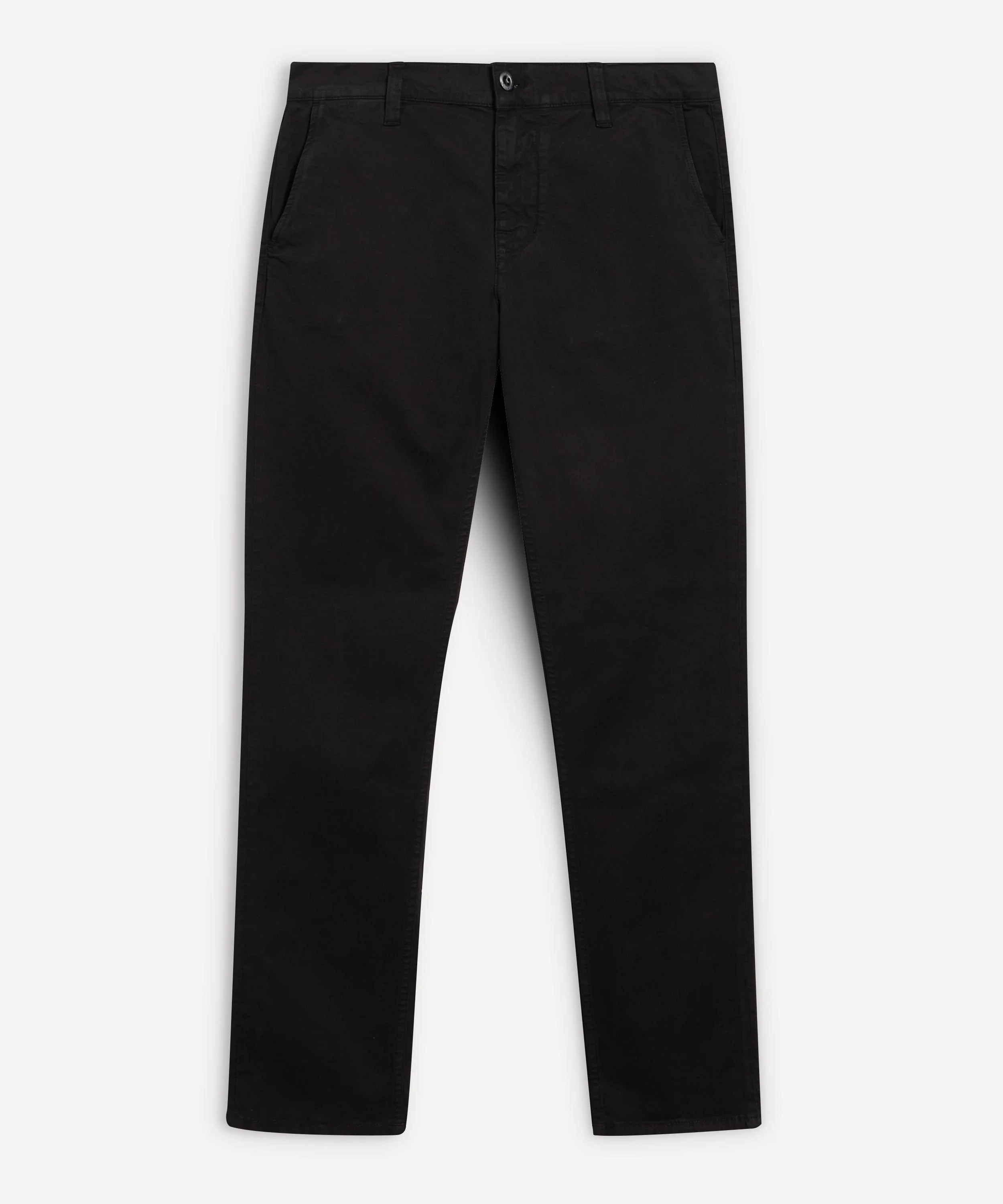 DETAILS Easy Alvin black chinos Black colourway Slim tapered leg Zip fly closure Woven patch Four pockets Organic cotton composition SIZE & FIT Model is 186cm/6'1"; Chest: 92cm; Waist: 71cm and wears size 32 COMPOSITION & CARE 97% Cotton; 3% Elastane Machine washable