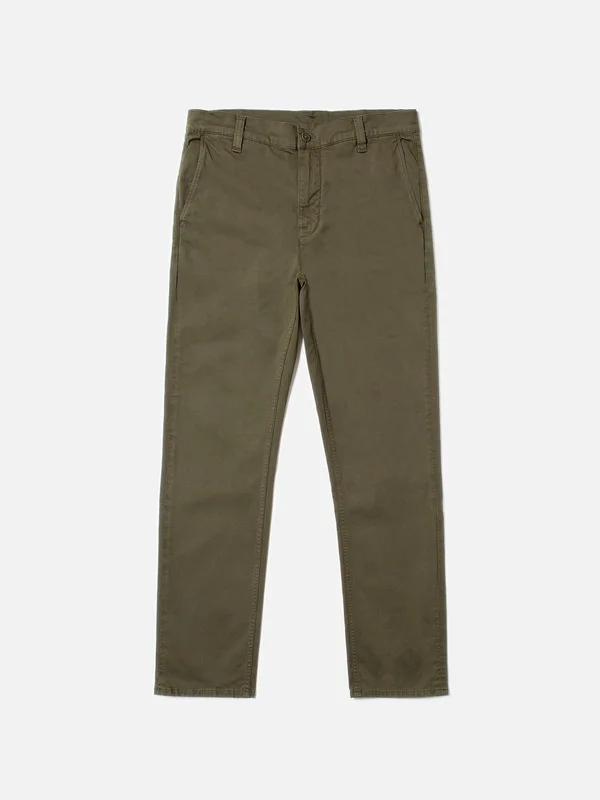 Slim fit four-pocket chino made in a clean organic comfort stretch twill. Fit and making considered it is the contemporary slim-fit chino perfected. Details - Organic cotton - Matching thread - Painted waistband button - Zip fly - Four pockets - Woven patch - Slim tapered fit - Slim leg opening 97% Cotton 3% Elastane Made in TN Slim fit four-pocket chino made in a clean organic comfort stretch twill. It is a contemporary classic with slanted front pockets, welt back pockets, chain stitch hems, and slim tapered fit. If you ask us, it is the perfect slim fit chino - fitted with a bit of room around the legs, making it look neat and fit very comfortably. Its sewn with heavy tone-in-tone thread with medium-short stitch length, which emphasizes its clean construction and pays homage to its workwear heritage.