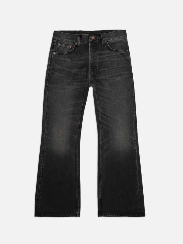 A mid waist regular-fit jean with a flared leg, featuring a deep, richly textured black wash. Crafted from exceptional black-overdyed-black denim with pronounced slubbiness, the fabric reveals a striking salt-and-pepper grain and a subtle crosshatch texture. While highlighting contrasts, the wash preserves deep pitch-black tones, creating a beautifully dynamic and dimensional finish. Details - Organic Cotton - 13 oz rigid denim - Black thread on all seams - Copper trims - Button fly - Jacron patch - Regular fit - Mid waist - Flared leg 100% Cotton Made in TN A mid waist regular-fit jean with a flared leg, featuring a deep, richly textured black wash. Crafted from exceptional black-overdyed-black denim with pronounced slubbiness, the fabric reveals a striking salt-and-pepper grain and a subtle crosshatch texture. While highlighting contrasts, the wash preserves deep pitch-black tones, creating a beautifully dynamic and dimensional finish.