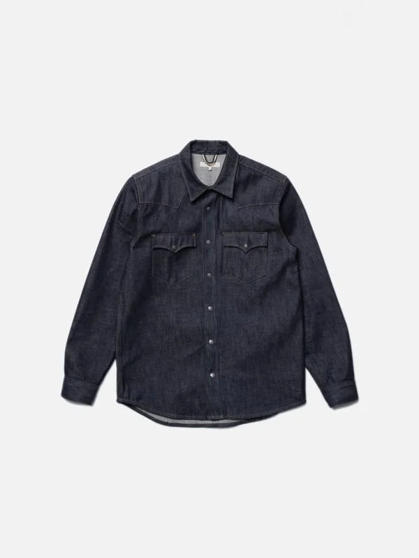 George, our regular fit shirt crafted from the extraordinary Dry Ace Selvage. Made from organic cotton. Size & Fit Model is wearing size: M Model's height: 189 cm / 6’2” Details - Organic cotton - 14.2 oz. Japanese rigid selvage denim - Beige pearl snap button - Tobacco thread allover - Regular fit 100% Cotton Made in TN We are thrilled to introduce our regular fit shirt George in the extraordinary Dry Ace Selvage. This remarkable fabric, weighing 14.2 oz showcases a rustic texture and a deep, redcast indigo hue, is a true masterpiece. Crafted by the renowned Shinya Mills in Okayama, Japan, it exemplifies the art of perfecting selvage denim imperfections. The story behind Dry Ace Selvage is as fascinating as the fabric itself. It all began with a vintage, unbranded pair of jeans believed to date back to the 1950s, discovered in a thrift store somewhere in the USA. These jeans displayed wear and significant fading, and most importantly an incredible texture. They made their way to Japan, where denim from the jeans was meticulously reverse-engineered in exhaustive detail. The art of reverse engineering denim is a hallmark of the artisanal Japanese denim industry. Dry Ace Selvage is a remarkable example of this craft, as well as a testament to the unique collaborative approach sometimes employed for premium Japanese denim. The rather extreme slub yarns are spun by Yamachu Mengyo Co. Ltd. in Osaka. The warp yarns undergo an impressive 20 dips in pure indigo dye, resulting in a deeply saturated surface with a notably substantial undyed core, courtesy of Kaihara Co. Ltd. in Hiroshima. Finally, the fabric is masterfully woven under low tension on vintage shuttle looms by Shinya Mills in Okayama. The guiding principle here is - do what you do best - and the final product beautifully reflects the craftsmanship at each stage of the denim's creation. Ace's distinctive character arises from its thick and highly irregular yarns, generous use of indigo, and low-tension weaving. These factors contribute to its appealingly rugged ageing property. Over time, the dye rapidly abrades from the surface of the yarns, emphasizing their slub, particularly in the vertical direction. When, or if, the jeans are washed, the yarns slightly rearrange, reducing the vertical slub and transitioning to a rustic crosshatch texture with a coarse salt 'n pepper effect. Notably, the heavily saturated surface of the indigo yarns entails an extraordinary evolution. Washing initially causes the dye to bleed onto the white weft, increasing the depth of color. With successive washes, the indigo gradually fades into brighter brilliant blue hues while deeper tones are preserved at seams and folds. Due to its unparalleled ageing property, Ace unquestionably stands as one of the finest Japanese selvage denims we have ever encountered. We are therefore very proud to offer it in George.
