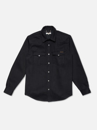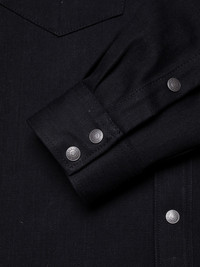 Regular fit denim shirt with evident Western vibes, crafted in our all-time favorite Japanese black selvage denim. Details - Organic cotton - 14.5 oz. Japanese rigid selvage denim - Antique silver snap buttons - Black thread allover - Regular fit 100% Cotton Made in TN We are thrilled to introduce our regular fit shirt George in our all-time favorite Japanese black selvage denim. This 14.5 oz. denim boasts a tight weave density and generous starch application, ensuring remarkable rigidity. But what truly distinguishes it is its exceptional aging property, a testament to Kurabo Mills' blend of heritage and innovative denim craftsmanship. This denim stands out due to its unique construction: the warp, visible predominantly on the fabric's face, is yarn-dyed black, allowing it to gradually fade with wear and washes. Conversely, the weft, visible on predominantly on the fabric's back, is dyed with a 'stay black' dye, retaining its deep black hue without fading. Although this might seem unconventional for fading denim, it yields intriguing contrasts, emphasizing the warp-weft intersections. This clever construction promises more pronounced contrasting fades compared to regular dry black denim. Beyond its unique yarn combination, the denim's tight weave, stiff texture, pronounced twill lines and slightly coarse yarns create an exquisite surface structure and marbling effects with wear and washes. For optimal results, we recommend wearing our dry denim regularly for at least six months before the first wash. While entirely optional, this period encourages striking fades.