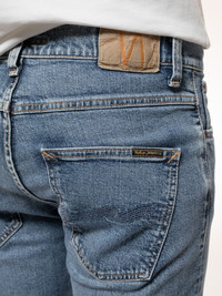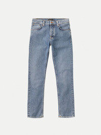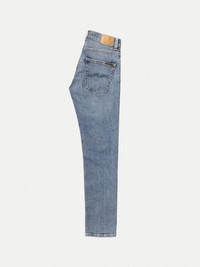 Slim fit jeans with a straight leg made in organic comfort stretch denim. These jeans have been washed to a mid-blue greyish tone. At seams, bright tones contrast deep dark indigo depots giving these jeans a rich contrast. The wash has pronounced the slight yarn slub of the Broken Twill denim, showcasing both marble wash effects and a grainy texture. Soft abrasions highlight and add a slightly worn-in look. Broken Twill is an alternation of the twill weaving pattern. A regular twill has a diagonal structure, whereas a Broken Twill has an altering direction of the twill pattern. Looking closely on a Broken Twill you'll see a zig-zag structure. Back in the day, Broken Twill was developed to counteract the, at the time, inevitable leg-twist that regular denim was synonymous with. Broken Twill also came with another benefit; it came out softer and more comfortable, which, apart from its aesthetics, is an excellent reason for using it. - Organic cotton - 13.75 oz. comfort stretch denim - Light tobacco thread at seams - Light tobacco and Indigo thread at inseam - Indigo back pocket embroidery - Copper trims - Button fly - Jacron patch - Slim fit - Mid waist - Straight leg - Slim leg opening - 99% Cotton / 1% Elastane - Made in Tunisia