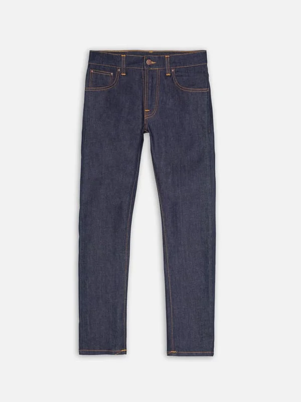 Jeans with a straight slim fit made in organic comfort stretch denim. With its slim fit, mid waist and straight leg Grim Tim is one of our most popular slim fits. Size & Fit Model is wearing size: W30" L30" Model's height: 183 cm / 6’0” Details - Organic cotton - 12.75 oz comfort stretch denim - Navy back pocket embroidery - Orange threads on all other seams - Copper trims - Button fly - Jacron patch - Slim fit - Mid waist - Straight leg - Slim leg opening 99% Cotton 1% Elastane Made in IT Jeans made in 12.75 oz dry comfort stretch denim. The yarns have been yarn-dyed prior to the weaving to keep the yarn-core white. An aspect that allows for some serious break-in potential. We recommend 6 months of hard, every day, wear before the first wash, if not longer. This way you will end up with a beautiful pair of worn-in jeans. It sure is a long time, however, it's only a recommendation. As long as you give them love, the result will be great.