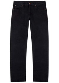 INFO & CARE - Nudie Jeans black denim jeans - Mid-rise fit straight-leg cut five pockets belt loops designer plaque slightly faded finish - Concealed zip and button fastening at front - Designer wash: Black Forest - 100% cotton SIZE & FIT - Machine wash cold inside out to avoid colour transfer - Inside leg length: 31.5 inches/ 80cm - Front rise: 10 inches/ 25.5cm - Midweight - Model is 6'2"/ 188cm and wears a size UK W32