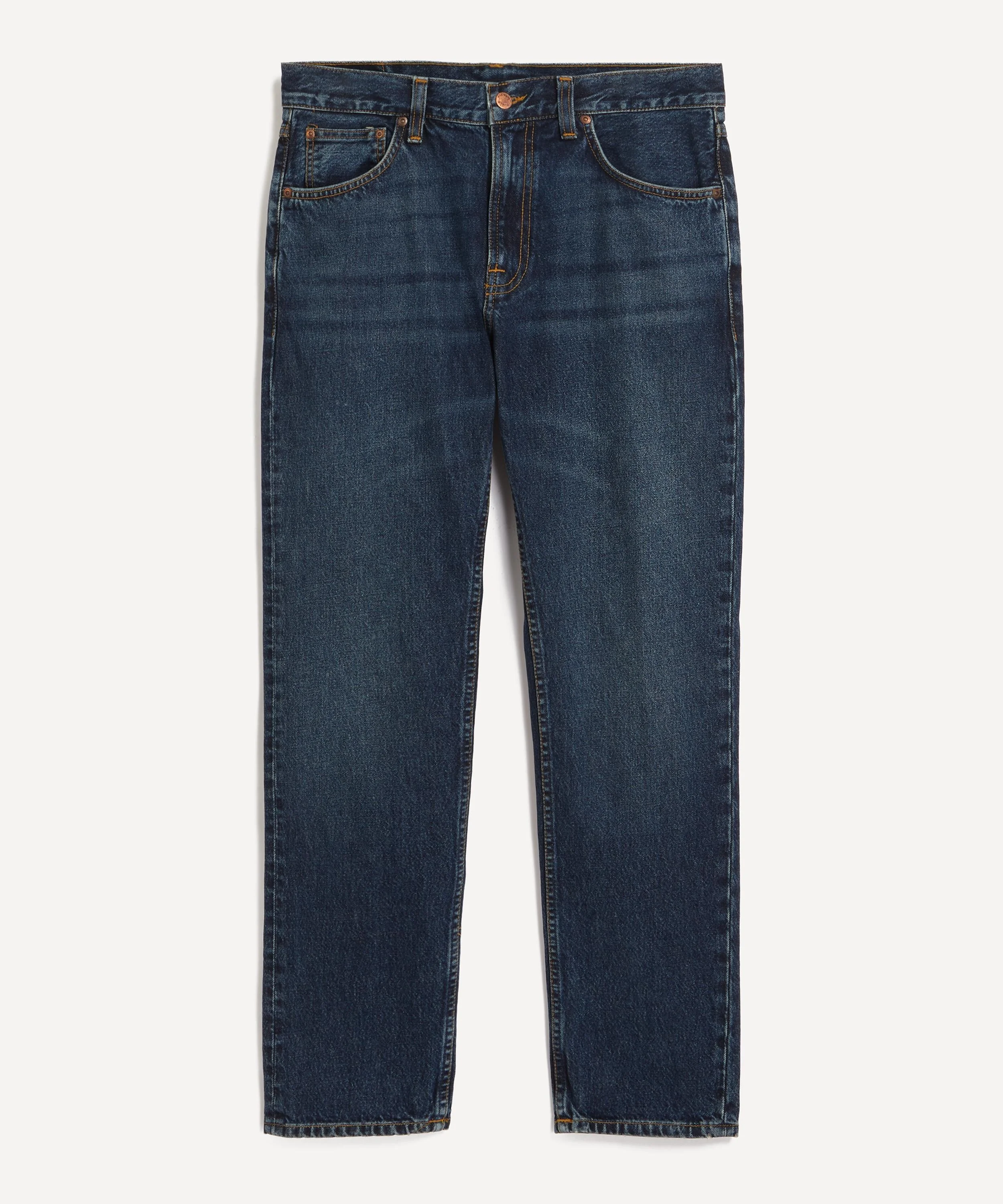 DETAILS Gritty Jackson jeans Designer wash: Blue Soil 14.9oz rigid denim Tobacco thread at seams Navy back pocket embroidery Copper trims Zip fly Jacron patch Regular fit Mid waist Straight leg Regular leg opening SIZE & FIT Model is 186cm/6'1"; Chest: 92cm; Waist: 71cm and wears a size 32