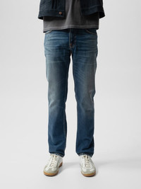 Regular-fit jeans with a straight leg in a beautifully saturated mid-blue wash, featuring contrasting wear marks. Crafted from denim with a rustic ring-spun texture and a rich indigo tone, these jeans showcase a lovely, subtle vertical slub and a salt-and-pepper pattern that accentuates the darker areas. Details - Regenerative organic cotton - 13.25 oz. rigid denim - Orange thread at seams - Copper trims - Zip fly - Jacron patch - Regular fit - Mid waist - Straight leg - Regular leg opening 100% Cotton Made in TN Regular-fit jeans with a straight leg in a beautifully saturated mid-blue wash, featuring contrasting wear marks. Crafted from denim with a rustic ring-spun texture and a rich indigo tone, these jeans showcase a lovely, subtle vertical slub and a salt-and-pepper pattern that accentuates the darker areas.