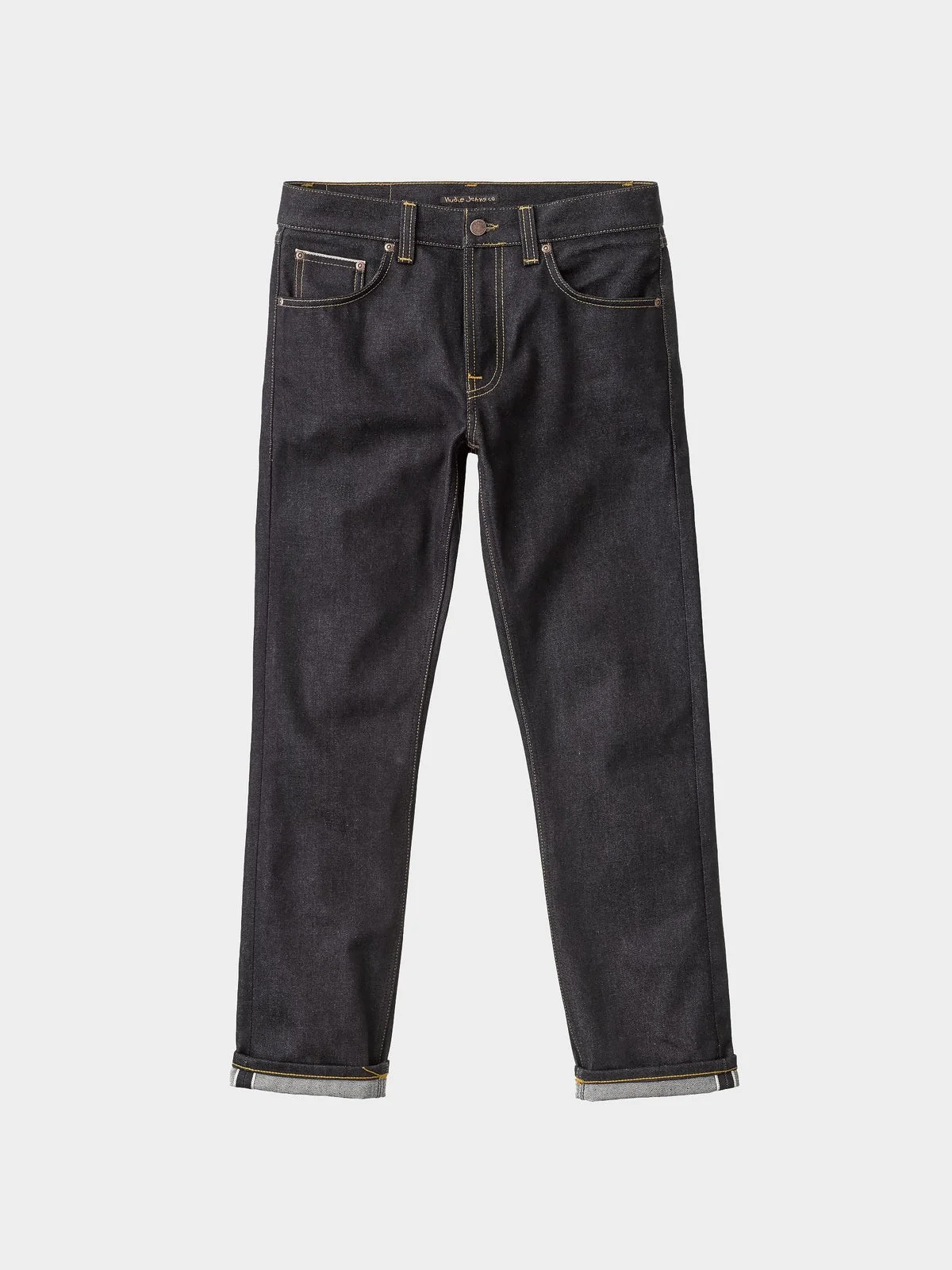 Gritty Jackson is a regular straight fit with a mid-waist and zip fly. Its well-balanced legroom gives the fit a neat silhouette while also offering great comfort. This is Nudie's modern take on what we consider to be the most classic and versatile jeans fit ever. Think 501. Made exclusively with rigid denim. Regular fit jeans with a straight leg made in organic rigid denim. These jeans are made from a rigid 14.25 oz Turkish selvage denim. The denim has a deep dark indigo tone, flat surface, and a uniform diagonal structure. With wear and washing the denim will develop an utterly beautiful depth as the surface will fade while darker tones will be preserved within the diagonal twill lines. The tobacco thread at seams adds a subtle contrast while the dark blue back pocket embroidery blends nicely with the deep dark denim. With wear, as with all our dry denim, these jeans will develop a uniquely worn-in look. The contrast between the tobacco seams and the denim will decrease while the dark blue back pocket embroidery will become more evident. - Organic cotton - 14.25 oz. Turkish rigid Selvedge denim - Dark blue back pocket embroidery - Tobacco thread on all other seams - Copper trims - Zip fly - Jacron patch - Regular fit - Mid waist - Straight leg - Regular leg opening - 100% cotton - Made in Tunisia - Minimal shrinkage with a cold wash and hang dry