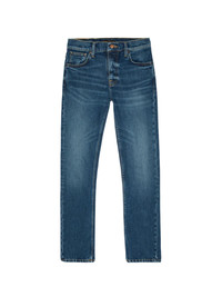 Slim-fit jeans featuring a straight leg in a mid-blue wash, boasting a gently worn appearance and a stunning blue hue. Crafted from Nudie's beloved stretch denim renowned for its exceptional texture, these jeans exude an elegantly rustic charm. The soft worn look, vibrant highlights, and brilliant blue tone, subtly tinged with a hint of green, offer a perfect blend of simplicity and eye-catching appeal. - 99% organic cotton 1% elastane - 13 oz comfort stretch denim - Tobacco thread at seams - Indigo back pocket embroidery - Copper trims - Button fly - Jacron patch - Slim fit - Mid waist - Straight leg - Slim leg opening - Made in TN