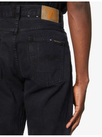 PRODUCT DETAILS - Nudie Jeans denim jeans - 100% cotton - Exposed button and concealed zip-fly fastenings at front - Slim-fit, mid-rise, straight leg, belt loops, five pockets, branded hardware, branded patch at back, V-shaped yoke at back, embroidered brand tab at back, embroidery at back pockets, partially lined - Machine wash cold - Size 32: rise 11in / 26cm, inside leg 31in / 79cm, leg opening 16in / 41cm - Model is 6ft 2in/1.88m and wears a size UK 32 - Midweight, non-stretch Ref: R03802054
