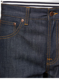 PRODUCT DETAILS - Nudie Jeans denim jeans - 100% cotton - Button and zip-fly fastening - Regular fit, mid-rise, straight leg, structured waistband with belt loops, five pockets, brand patch and embroidered applique at back, indigo wash, contrast stitching, branded hardware - Machine wash cold - Made in Italy - Size UK 32: rise 11.5in / 29cm, inside leg 32in / 81cm, leg opening 18in / 46cm - Model is 6ft 2in/1.88m and wears a size UK 32 - Midweight, non-stretch Ref: R04314042
