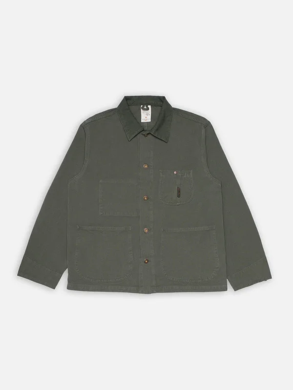 The Howie jacket features a generous fit, staying true to the essence of a classic work jacket. Crafted from our "Duck Canvas," a pale fir-green 2-ply canvas weave, this jacket is detailed with tonal stitching and copper "Donut" buttons. The result is a thoughtful piece, blending mid-20th-century vintage hunting gear inspiration with a workwear aesthetic. Details - Organic Cotton - 11 oz. Rigid Duck canvas - Matching thread at seams - Copper "Donut" buttons - Relaxed Fit 100% Cotton Made in TN The Howie jacket features a generous fit, staying true to the essence of a classic work jacket. Crafted from our "Duck Canvas," a pale fir-green 2-ply canvas weave, this jacket is detailed with tonal stitching and copper "Donut" buttons. The result is a thoughtful piece, blending mid-20th-century vintage hunting gear inspiration with a workwear aesthetic. Curious about the "Duck Canvas"? Let us explain. This fabric is meticulously constructed using irregular ring-spun yarns twisted into durable 2-ply threads, then yarn-dyed through a patented process to ensure it ages beautifully, much like its historical counterpart. The tightly woven dyed yarns create a firm, highly textural canvas that celebrates its imperfections, showcasing a unique crispness and depth. Perfectly suited for workwear, this robust fabric promises durability and a graceful aging journey, growing richer in character over time.
