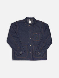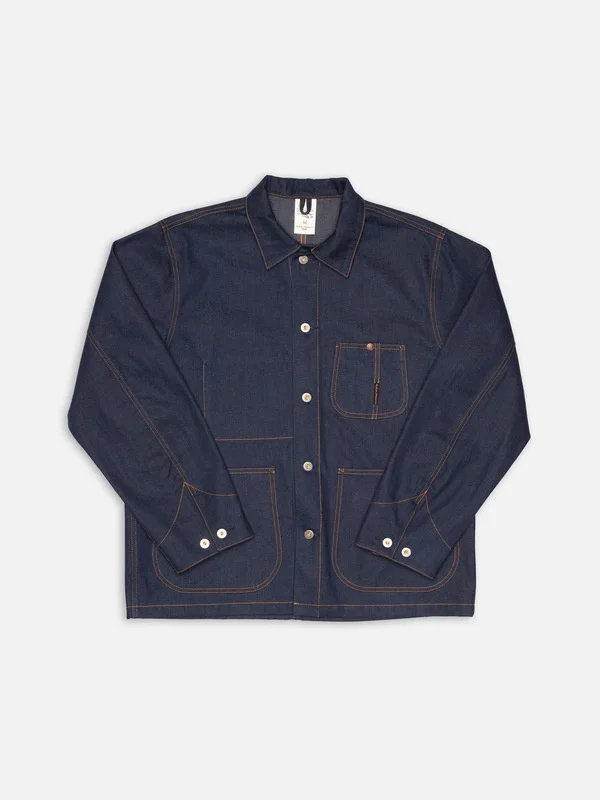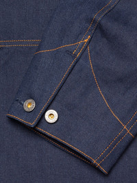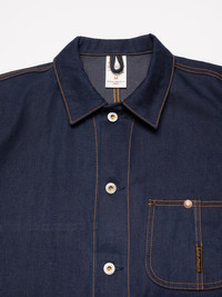 The Howie jacket features a generous fit, embodying the essence of a true work jacket. Crafted from our "Painter Denim," a deeply saturated pure indigo 2/1 denim, this jacket is detailed with Nudie Jeans' signature orange thread and stainless steel "Donut" buttons. Details - Organic Cotton - 11.8 oz. rigid denim - Orange thread at seams - Stainless Steel "Donut" buttons - Relaxed Fit 100% Cotton Made in TN The Howie jacket features a generous fit, embodying the essence of a true work jacket. Crafted from our "Painter Denim," a deeply saturated pure indigo 2/1 denim, this jacket is detailed with Nudie Jeans' signature orange thread and stainless steel "Donut" buttons. The result is a meticulously crafted, vintage-inspired denim with an expertly tailored fit, brought to life by the bold contrast of our signature orange thread. A thoughtful reinterpretation of traditional workwear, blending past influences with Nudie Jeans' aesthetic. Curious about the "Painter Denim"? We're glad you asked. We spent years meticulously developing this fabric to achieve the look and feel of classic 2/1 workwear denim. Made from irregular ring-spun yarns in both warp and weft, the warp is yarn-dyed to a deep pure indigo tone, while the weft is dyed a grey shade. Woven in a 2/1 Z construction, the fabric presents a flatter surface compared to the more common 3/1 denim, resulting in a uniform rich blue hue. With a substantial weight of 11.8 oz, this robust denim offers durability and a dynamic break-in journey. As it ages, the stiffness creates natural creases, while the irregular texture and deep indigo tones evolve, revealing beautiful highs and lows over time.