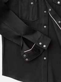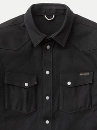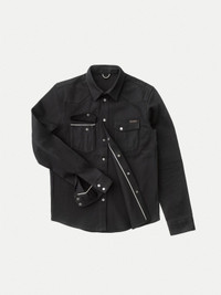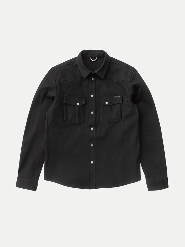 Slim fit denim shirt made in crispy 12.75 oz. dry black denim that will age beautifully with wear. Size & Fit Model is wearing size: M Model's height: 183 cm / 6’ Details - Organic cotton - 12.75 oz. turkish comfort stretch selvage denim - Black thread all over - Antique silver trims - Slim fit 99% Cotton 1% Elastane Made in TN Denim shirt made in crispy 12.75 oz. dry black comfort stretch selvage denim. The starch in the denim gives it its crispy hand and, most importantly, generates pronounced creases on the shirt when worn - allowing for some contrasting fades. The denim itself is woven on old school shuttle looms with yarns that have been yarn dyed. The shuttle looms interlace the yarns into the selvage denim and the yarn dying keeps the core of the yarns white allowing the weave to fade beautifully - a slow process that reflects how denim was made back in the day. The finished denim has a clear twill structure which is nicely balanced by a slight slub character which with wear and washing will get more pronounced in a perfectly imperfect way. The shirt itself is made with felled twin needle seams at body and arms. Front and back yokes have pointy shapes drawing inspiration from classic western shirts. All of these construction details will become more pronounced with wear and generate beautiful contrasts at seams and folds. Selvage details can be found at cuffs, pockets, hang band and at the front placket. If you are familiar with our shirt fit Jonis, then Jonas is best explained as its twin - looking very similar but with slightly different characteristics. Compared to Jonis, Jonas has more room for movement as well as new shoulder and arm hole construction. Making Jonas more comfortable while still being slim. An improved Nudie classic piece with tons of break-in potential! As with all our dry denim we recommend at least 6 months of daily wear before the first wash to achieve contrasting fades. This is of course just a recommendation.