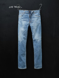 The Lean Dean Hidden Tracks faithfully replicate the fades and wear marks of an original pair of worn-in Nudie Jeans. Using a precise method, every detail of the original has been captured and recreated on a new pair of jeans. Details - Organic cotton - 11.25 oz. stretch denim - Orange thread at seams - Copper trims - Zip fly - Jacron patch - Slim fit - Mid waist - Tapered leg - Slim leg opening 99% Cotton, 1% Elastane Made in IT The Lean Dean Hidden Tracks faithfully replicate the fades and wear marks of an original pair of worn-in Nudie Jeans. Using a precise method, every detail of the original has been captured and recreated on a new pair of jeans. Crafted from exceptional denim, these jeans are washed to a light blue indigo tone with near-white highlights. The fabric features a pronounced diagonal texture with a well-balanced slub that renders a salt-and-pepper pattern accentuating the darker areas. The recreated fades and wear marks deliver an undeniably authentic worn-in aesthetic. These Lean Deans—our slim-fit jeans with a tapered leg—belong to the Life Tracks range: jeans based on a true story.