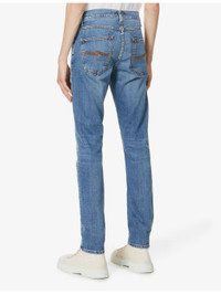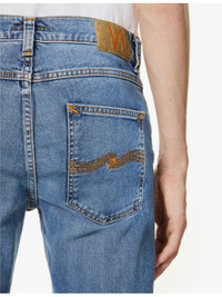 PRODUCT DETAILS - Nudie Jeans stretch-denim jeans - 99% cotton, 1% elastane - Exposed button and concealed zip-fly fastenings at front - High rise, belt loops, five pockets. brass-toned hardware, faded wash and whiskering, branded patch at back waistband, branded tab at back pocket, V-shaped yoke at back - Machine wash cold - Size UK 32: rise 10in / 26cm, inside leg 33in / 84cm, leg opening 14in / 36cm - Model is 6ft 2in/1.88m and wears a size UK 32 - Heavyweight, slight stretch Ref: R00039449