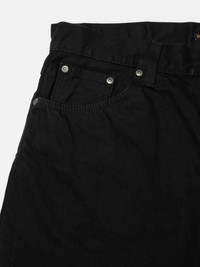 Details - Organic and recycled cotton - 14 oz. rigid denim - Black thread at seams - Antique silver trims - Button fly - Jacron patch - Loose fit - High waist - Wide leg - Wide leg opening These wide leg, loose fit jeans come in a deep pitch-black hue, treated with a simple rinse wash. This minimal wash enhances the denim’s texture, giving it a slightly muted black tone while softening the fabric. Crafted from yarn-dyed fibers in both warp and weft, the denim retains undyed yarn cores, allowing it to age much like classic indigo denim. Striking from day one, these jeans are designed to evolve—gradually fading into brighter, monochrome, texturally rich vintage masterpieces. With every wear and wash, they undergo a slow, graceful transformation. Simply put, they offer both instant appeal and the promise of tomorrow’s vintage.