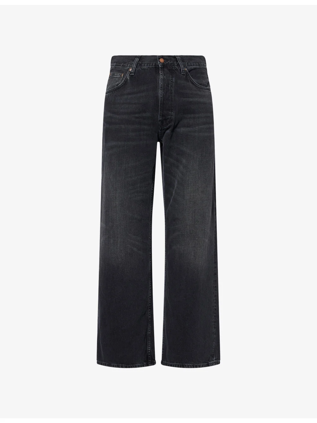 PRODUCT DETAILS - Nudie Jeans denim jeans - 100% cotton - Button and button-fly fastening at front - Wide leg, structured waistband, belt loops, classic five pockets, tonal topstitch, faded wash, whiskering detailing, brand patch at back - Machine wash at 40°C - Made in Tunisia - Size UK 32/32 rise 11.4in / 29cm, inside leg 31.1in /79cm, leg opening 22.4in / 57cm - Model is 6ft 2in/1.88m and wears a size UK 32 - Midweight, non-stretch Ref: R04541775