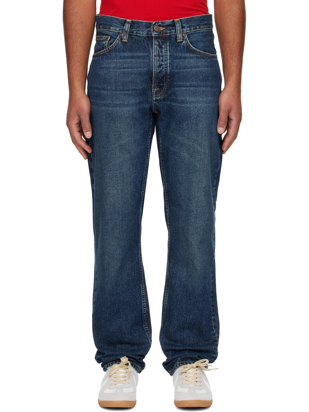 14.9 oz non-stretch organic cotton denim jeans. · Fading and whiskering throughout · Straight-leg · High-rise · Belt loops · Five-pocket styling · Button fly · Logo patch at back waistband and pocket · Contrast stitching in tan Supplier color: Blue soil 100% cotton. Made in Tunisia 252078M186016